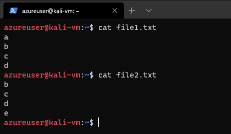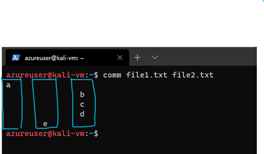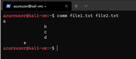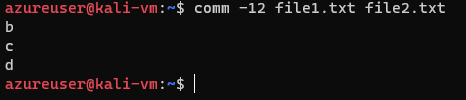 We can choose to suppress a specific column by using the option -n where n is either 1, 2, or 3. Say we wanted to output only the lines shared by both files, we can use comm -12 file1.txt file2.txt