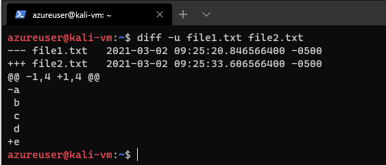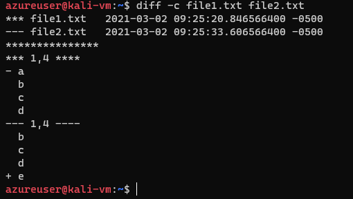 We can also use the unified format it's similar, but more concise, it eliminates the duplicated lines of context. diff -u file1.txt file2.txt