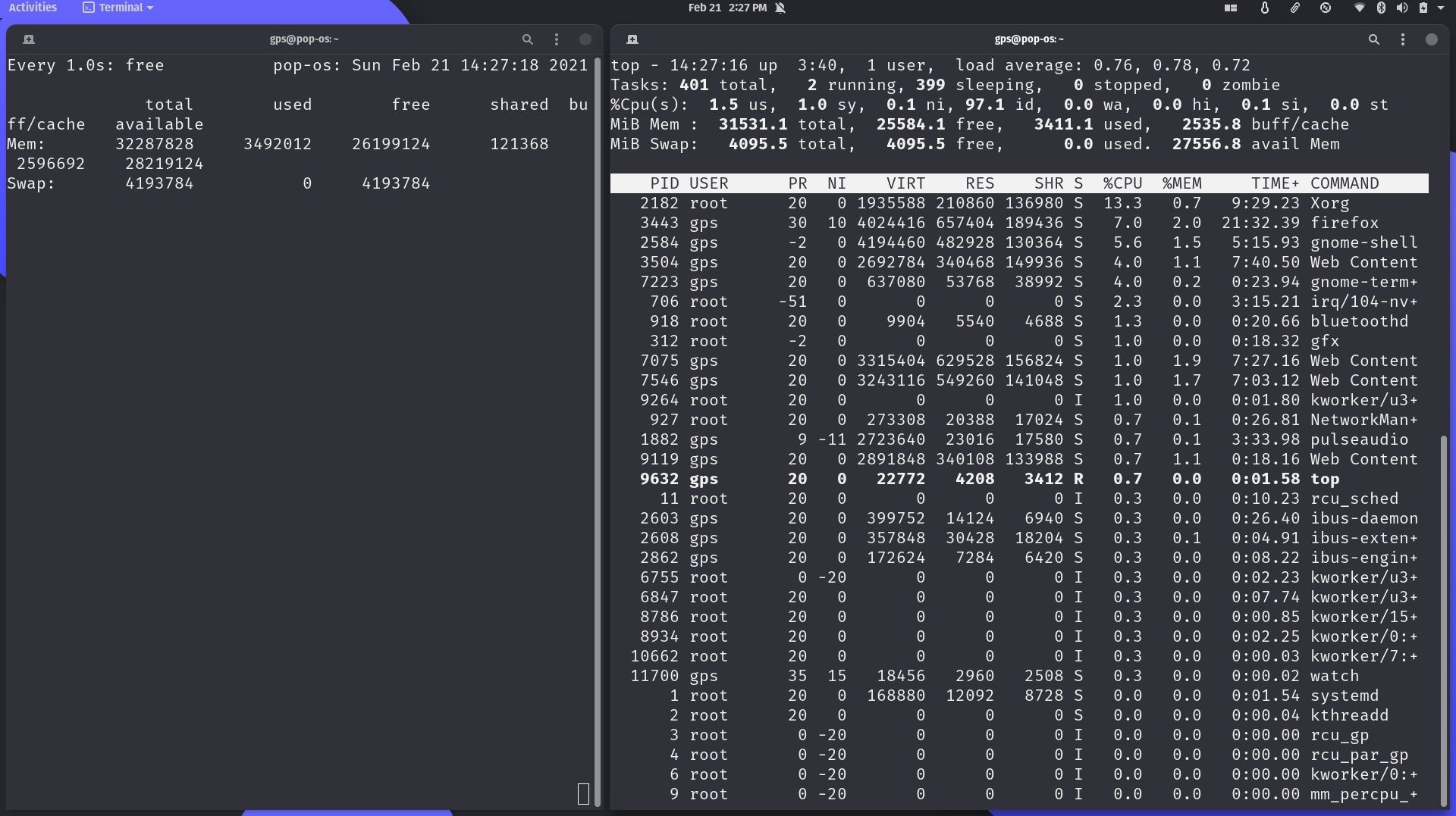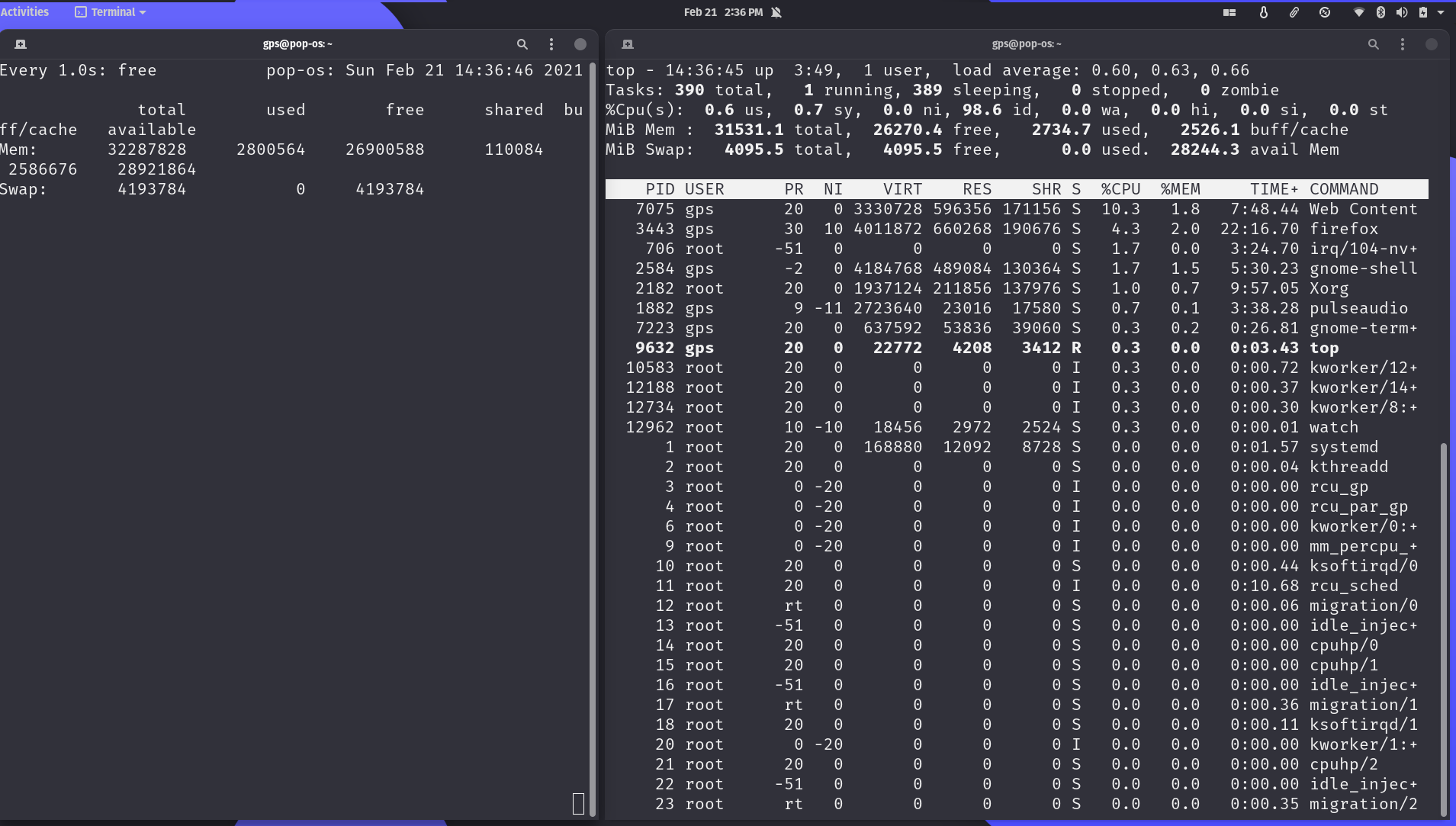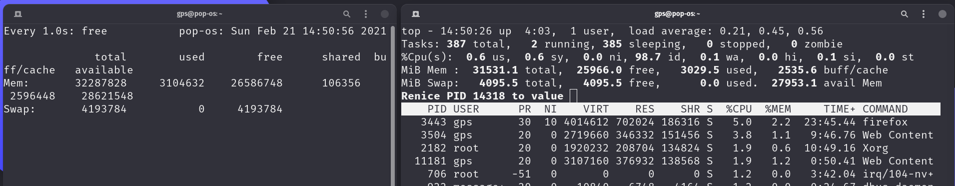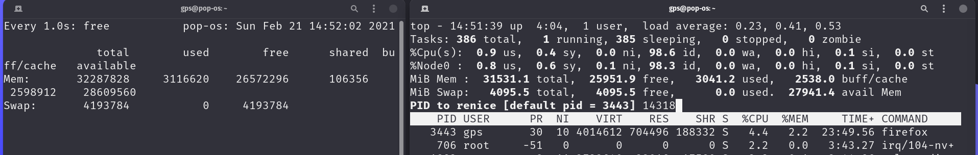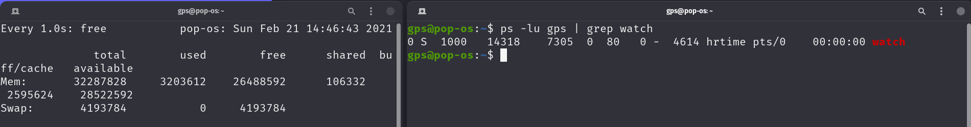 On the left, I've execute watch -n1 free to show me details on the system’s memory usage. On the left I've got top running and you can see that the watch command has PID 9717 and a nice value of 0.
