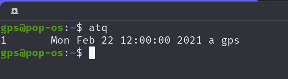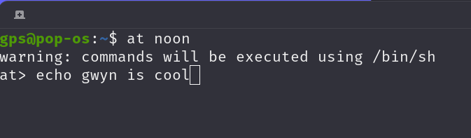 We can see that at puts us into interactive mode, here we type in the command we want executed at the specified time. Hit CTRL+D when you're done.