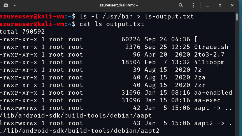 We can see that the ls output was not sent to the screen, but to the ls-output.txt file.