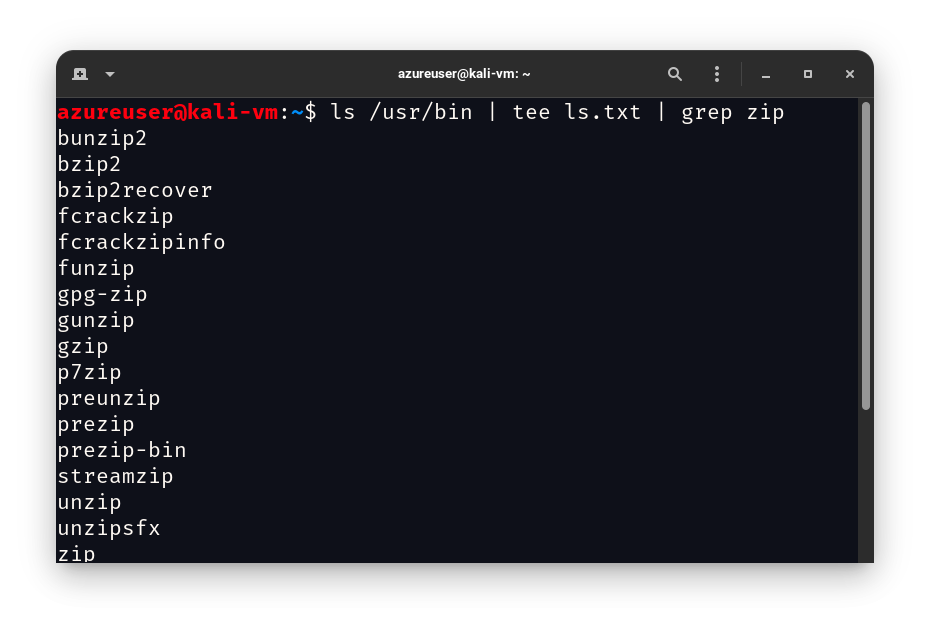 ls -l /usr/bin | lessit is possible to put several commands together into a pipeline. The commands used this way are referred to as filters. Filters take input, change it somehow and then output it.