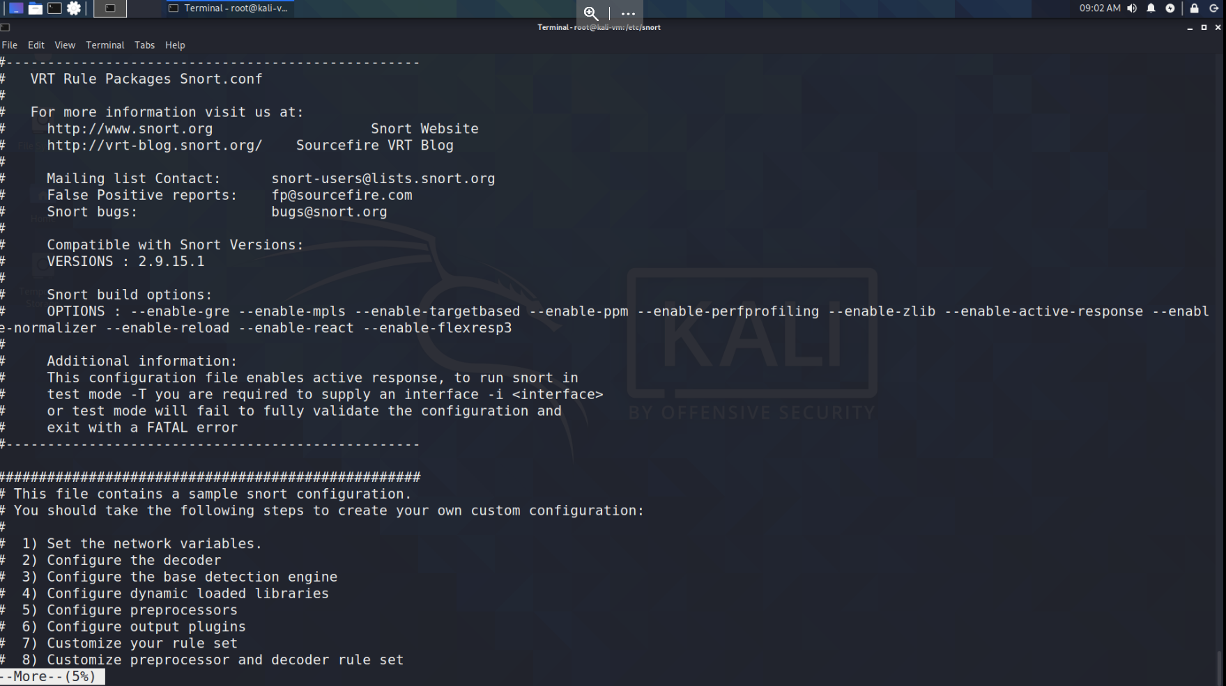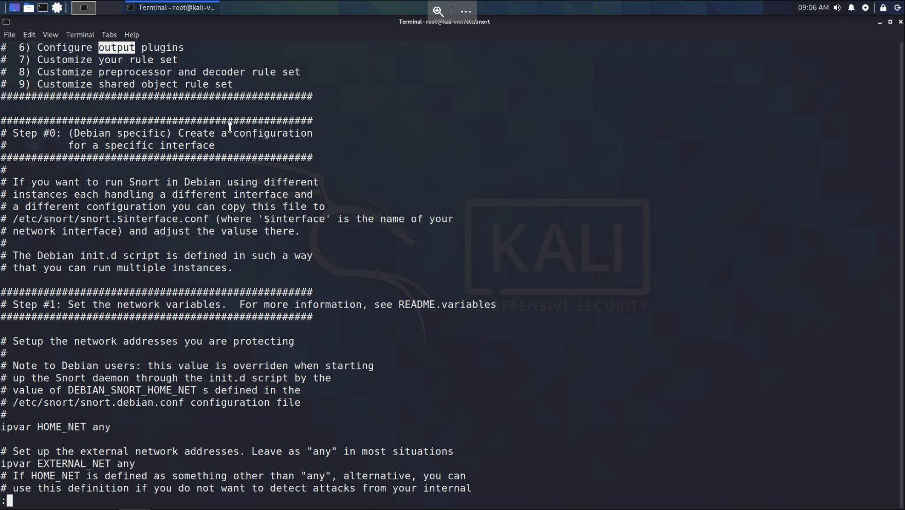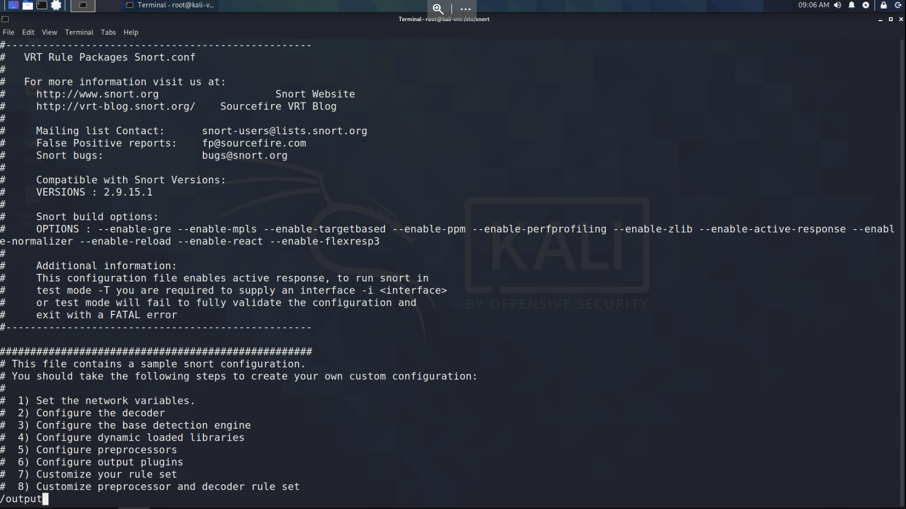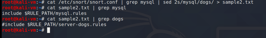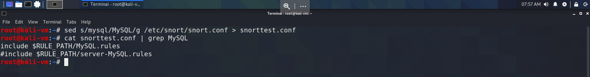 Let's use sed to find all the instances of mysl in the snort.conf file and replace it with MySQL and save the file as snorttest.conf in our current directory